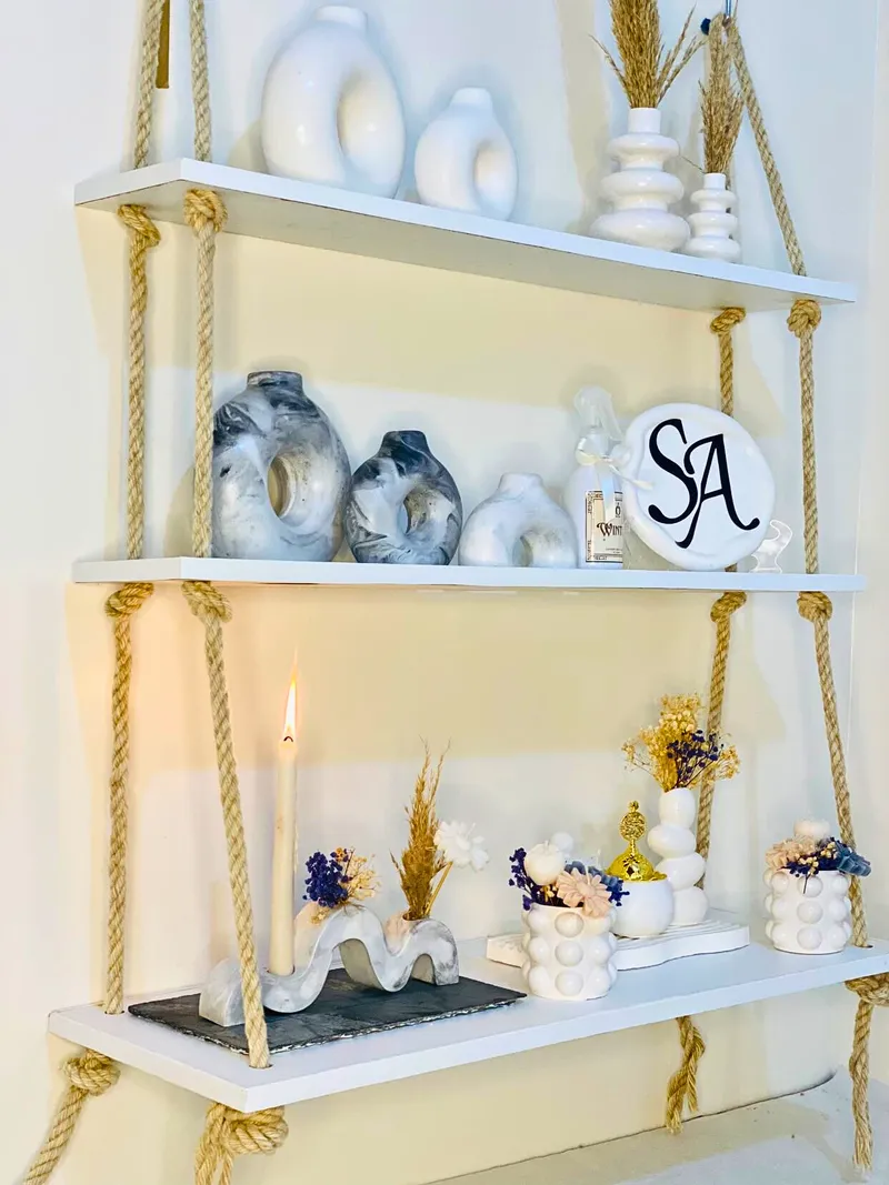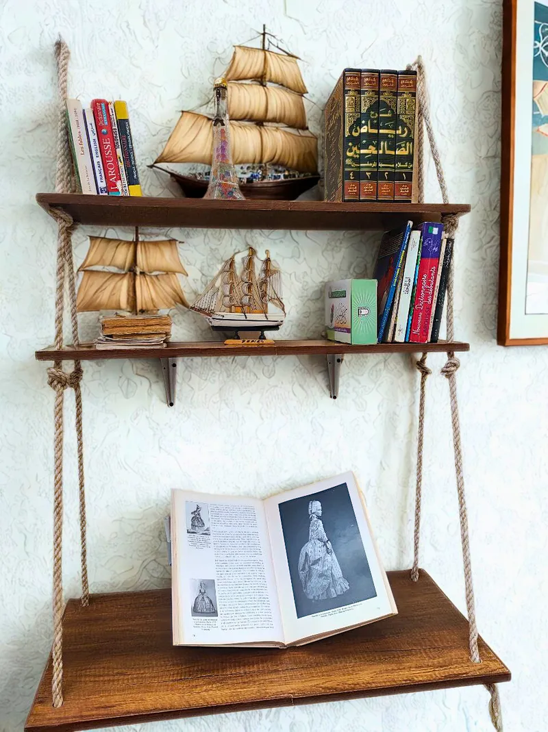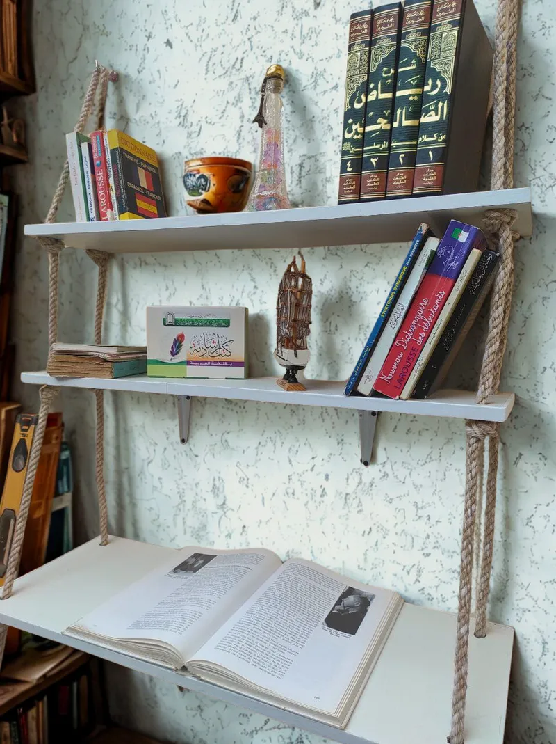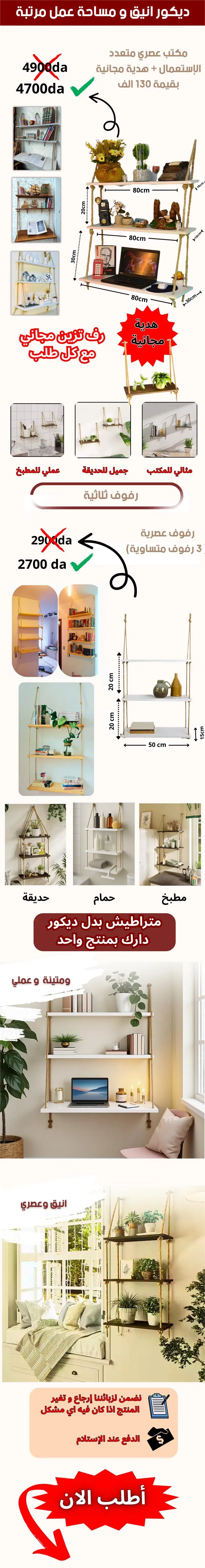 تصميم عصري، عملي، ويركّب وين تحب – في الصالون، الغرفة، ولا حتى في الكوزينة. الرف الكبير تستعملو كمكتب صغير للعمل ولا القراية، والرفوف العلوية تدي فيهم كتب، ديكورات، نباتات… وش تحب. الأبعاد: الرف السفلي (المكتب): 80 سم × 30 سم الرفين العلويين: 80 سم × 18 سم